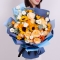 祝福在心中-3枝向日葵,12枝香槟玫瑰搭配橙色多头玫瑰、白桔梗、黄金球、尤加利叶